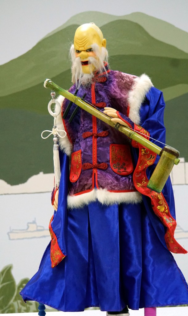 A notable character in the Golden Puppet Show, Guai Lao Zi, or the Weird Old Man, is known for his humorous personality and a warm heart. The Weird Old Man is forever sixty-three years old and has the martial arts abilities of Sound of the Magic Piano and Divine Horns. His weapon is called the “Magic Sound” and comprises of three stages. The Weird Old Man’s favorite catchphrase is “now you know,” which in Taiwanese is “jin ma li jia zhai.” In reference to his old age, his friends often call him big brother. Guai Lao Zi, along with Er Jia and Liu San make up the earliest trio group for the puppet show. Weird Lao Zi lives in the Wutong (Wútóng) Forest and is famous far and wide for his knowledge of Qihuang (Qíhuáng), ancient Chinese medicine. He has excellent medical skills and is good at playing the piano, giving him the name “Miracle Doctor and the Demonic Qin.” Guai Lao Zi later becomes acquainted with Liu San and Er Jia by rescuing the knights from the Central Plains, and they become good friends. Together, they help the main character, Shih Yen Wen (Shǐhyènwén), solve his problems, find the jade seal, solve the king’s danger, eliminate evil, and become the backing of the righteous path.